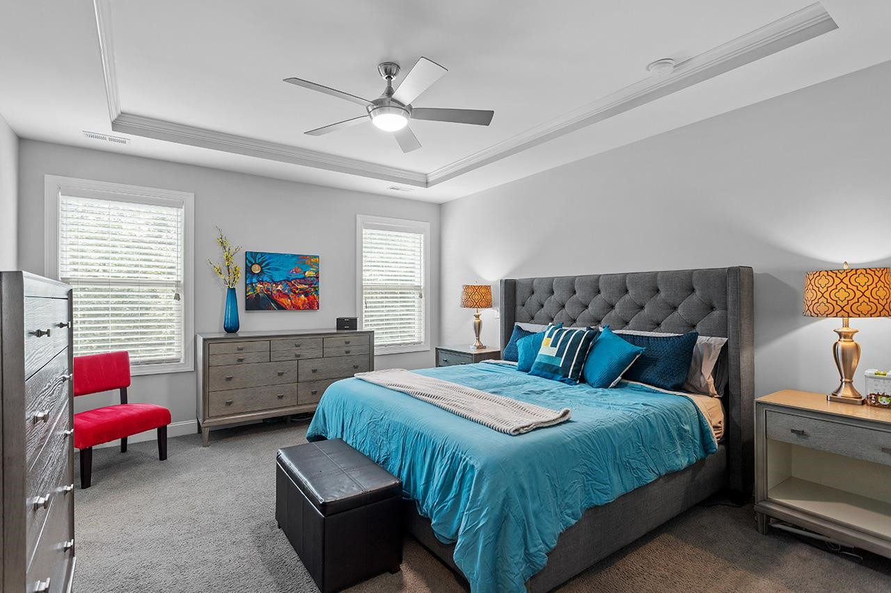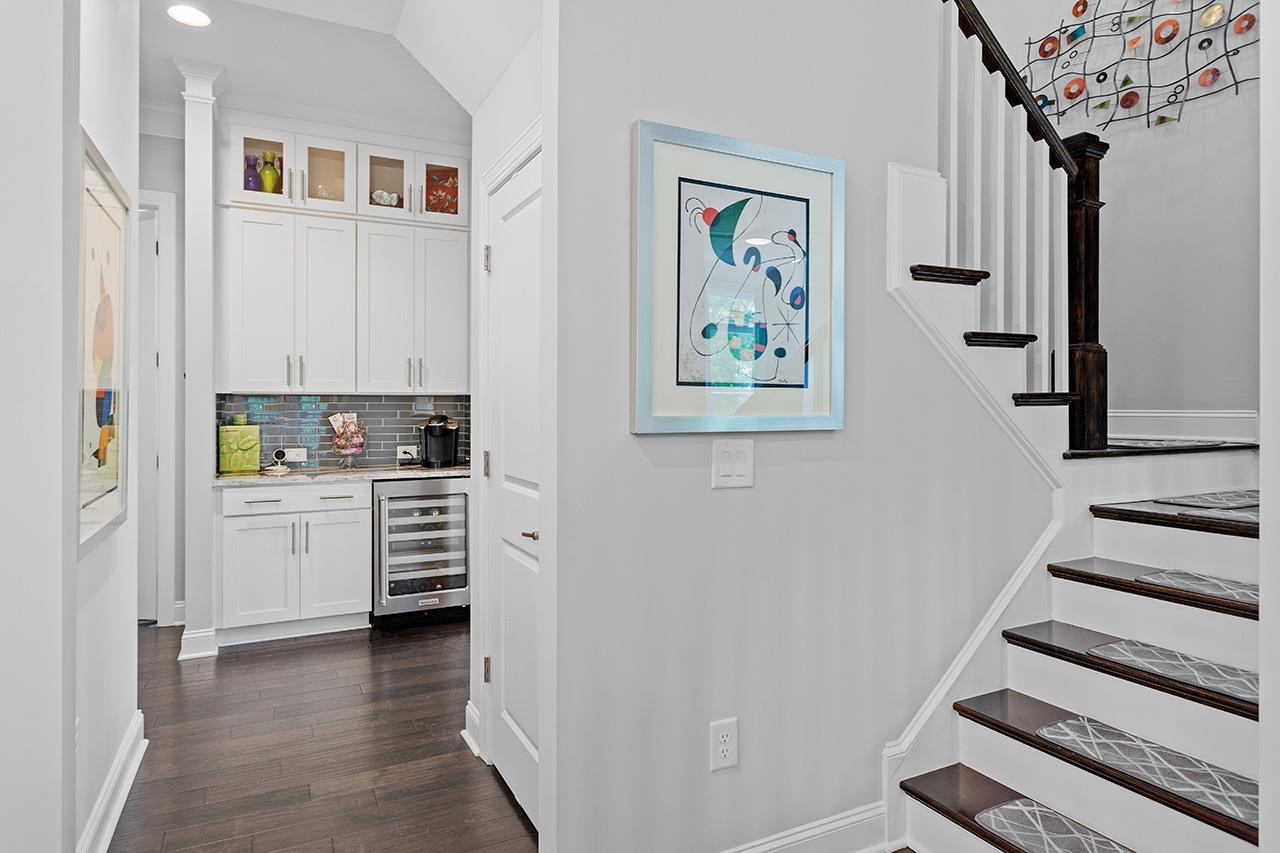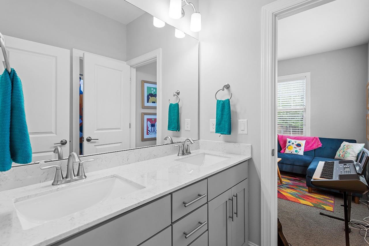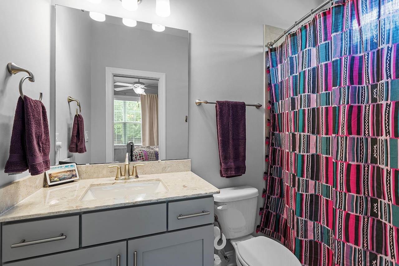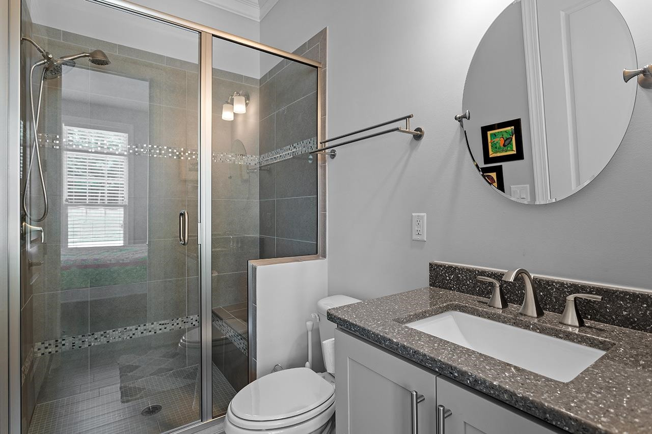 Beautifully landscaped, meticulously maintained home in sought-after WOODCREEK neighborhood. OPEN floor plan boasts 10 ft ceilings & tons of large windows for abundance of NATURAL light. GOURMET kitchen includes custom painted large island, double wall ovens with separate under cabinet microwave, gas stove, gorgeous countertops and tile backsplash, transom cabinets over uppers for extra storage and beautiful custom finish. Butler's pantry with wine fridge is perfect for entertaining! Main level also features separate dining room and a bedroom with full bath . LOFT space & BONUS room upstairs. Fabulous master suite with tray ceiling and large bath featuring his/hers separate vanities and large frameless walk-in shower. Gorgeous SCREENED PORCH overlooks large, flat backyard with wooded view. HOA includes resort style pool, playground, Clubhouse and tennis court access. WELCOME HOME!