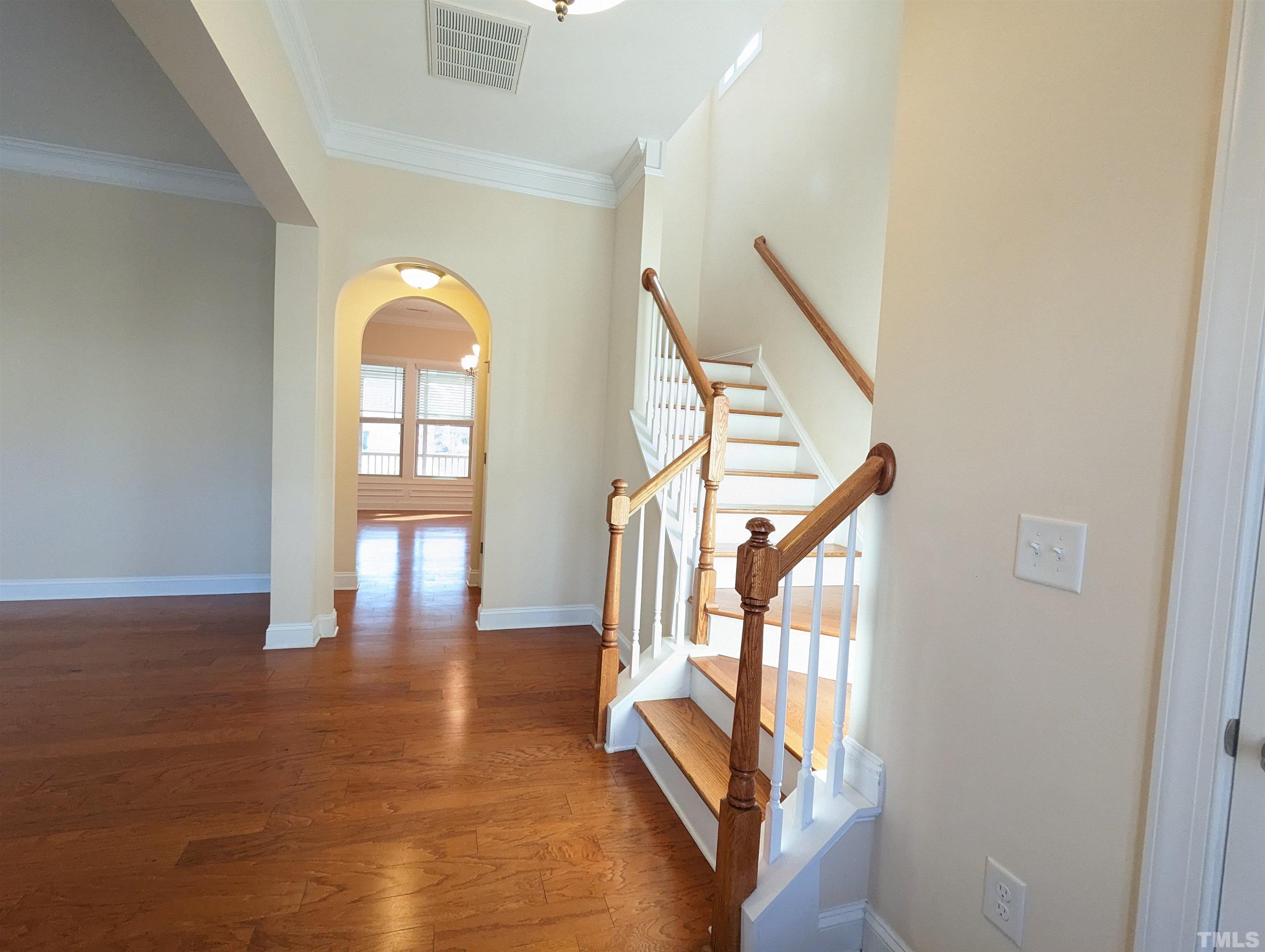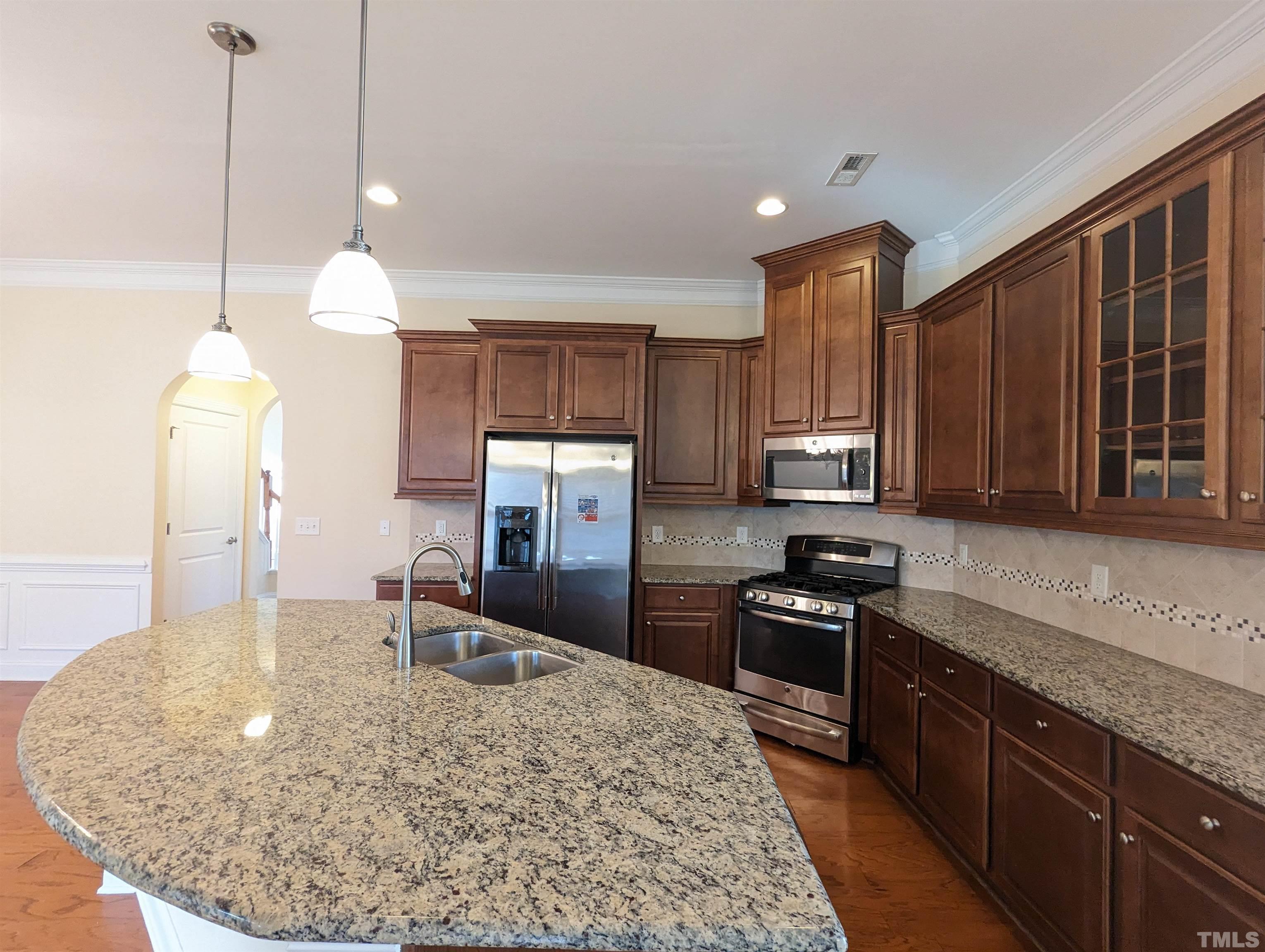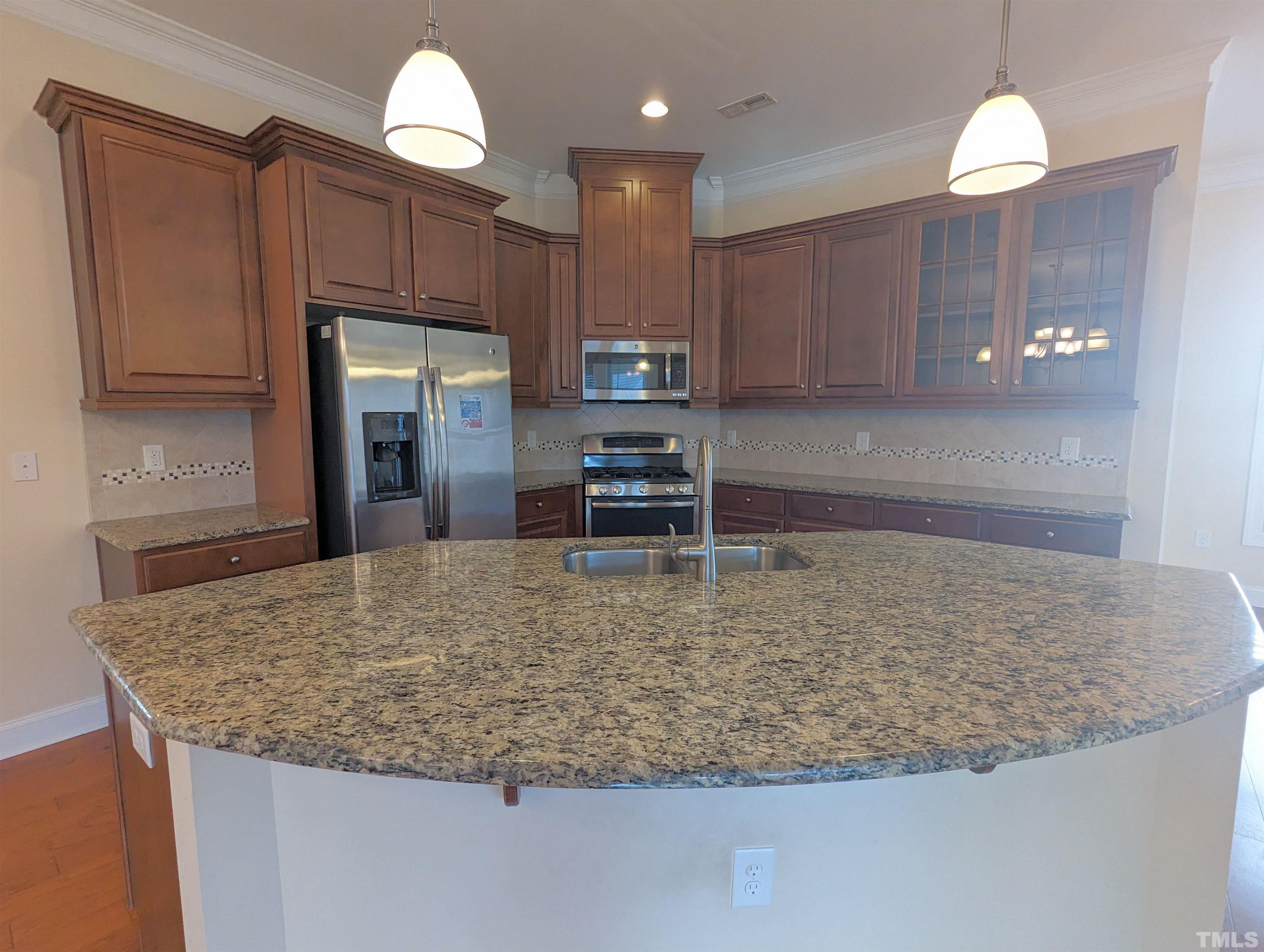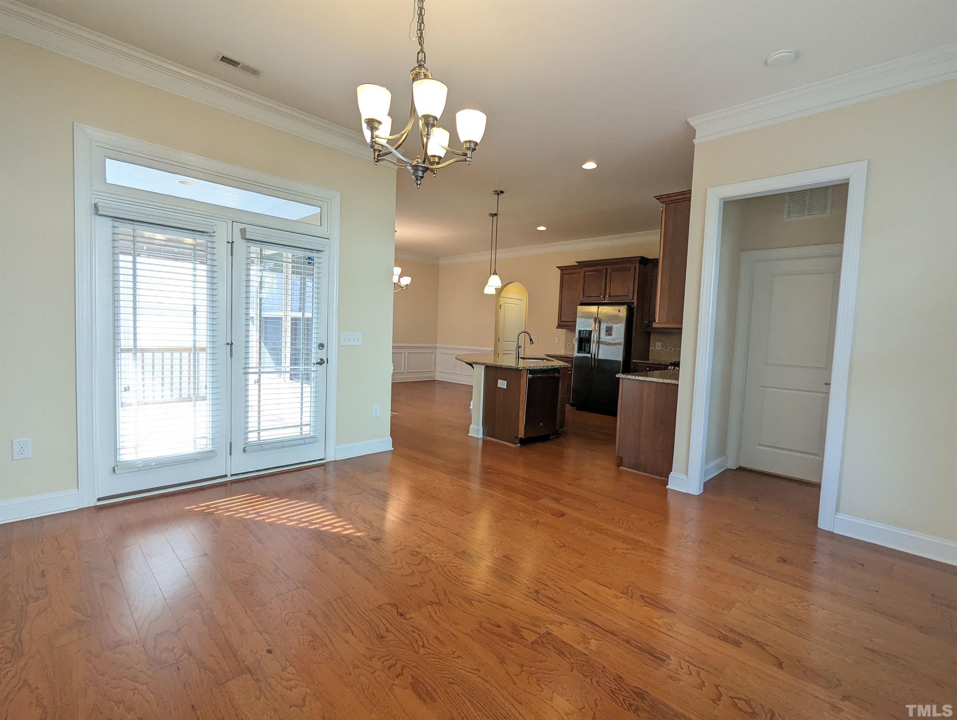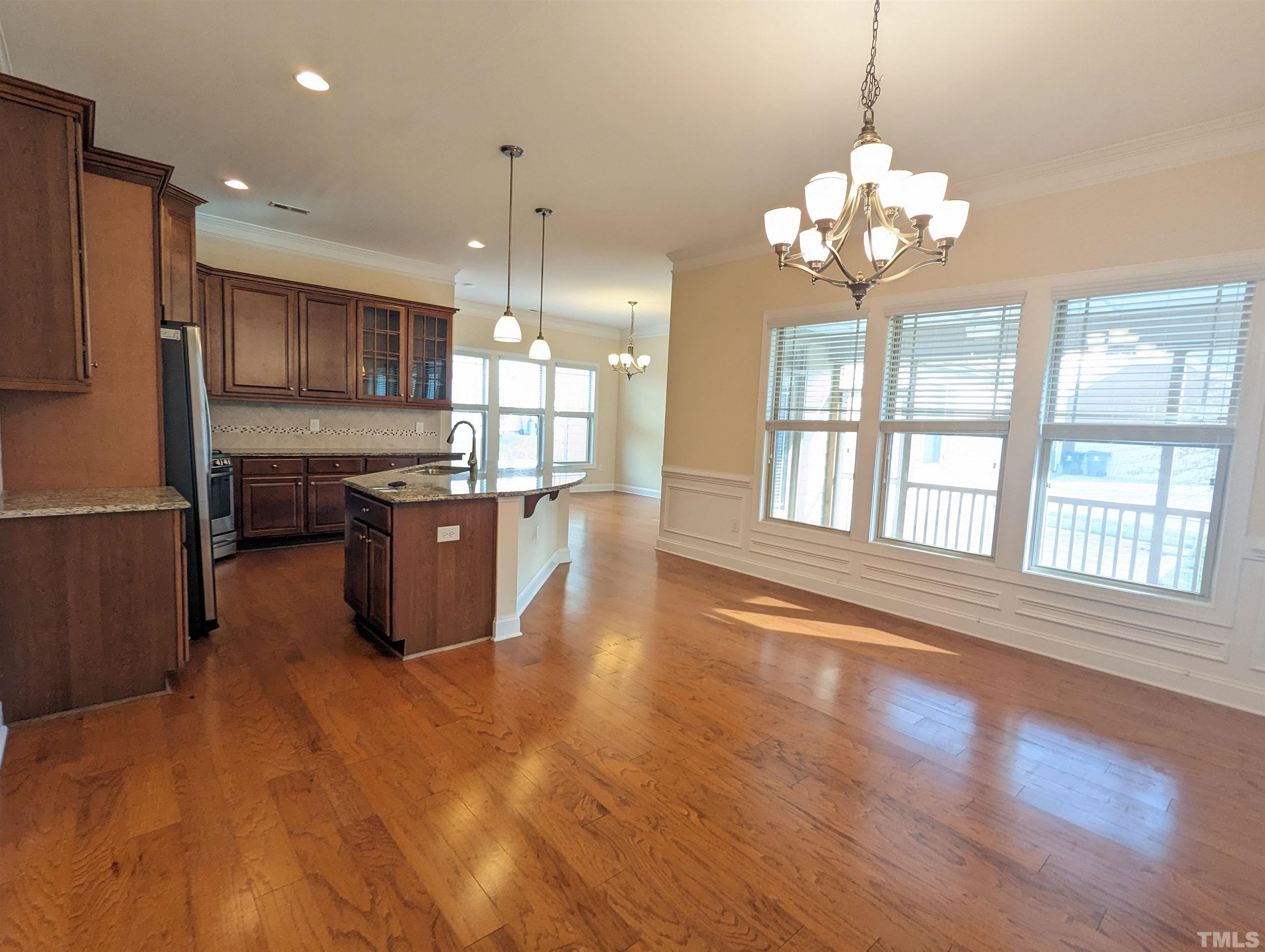 Gorgeous 3 Bedroom Single House w/Screened Patio at Kitts Creek, Morrisville! Available Now! Open floor plan & hardwood flooring on main level. Family room w/gas logged fireplace follow by a beautiful kitchen w/many cabinets, backsplash tile, SS appliances, granite counter top, oversized island-great for breakfast area!, Formal dining room & breakfast nook with access to screened patio, brick paved patio, and backyard! 2nd Floor include 2 2nd bedrooms, a primary suite w/dual closets, 2 individual vanity, tub, walk-in shower w/tiled wall , water closet, Washer and dryer w/laundry sink are included. 2 car-garage rear entry! Mins to RTP, I-40, I-540! *it takes long time to get hot water on 1st floor* **Pictures were taken prior to the current tenant**